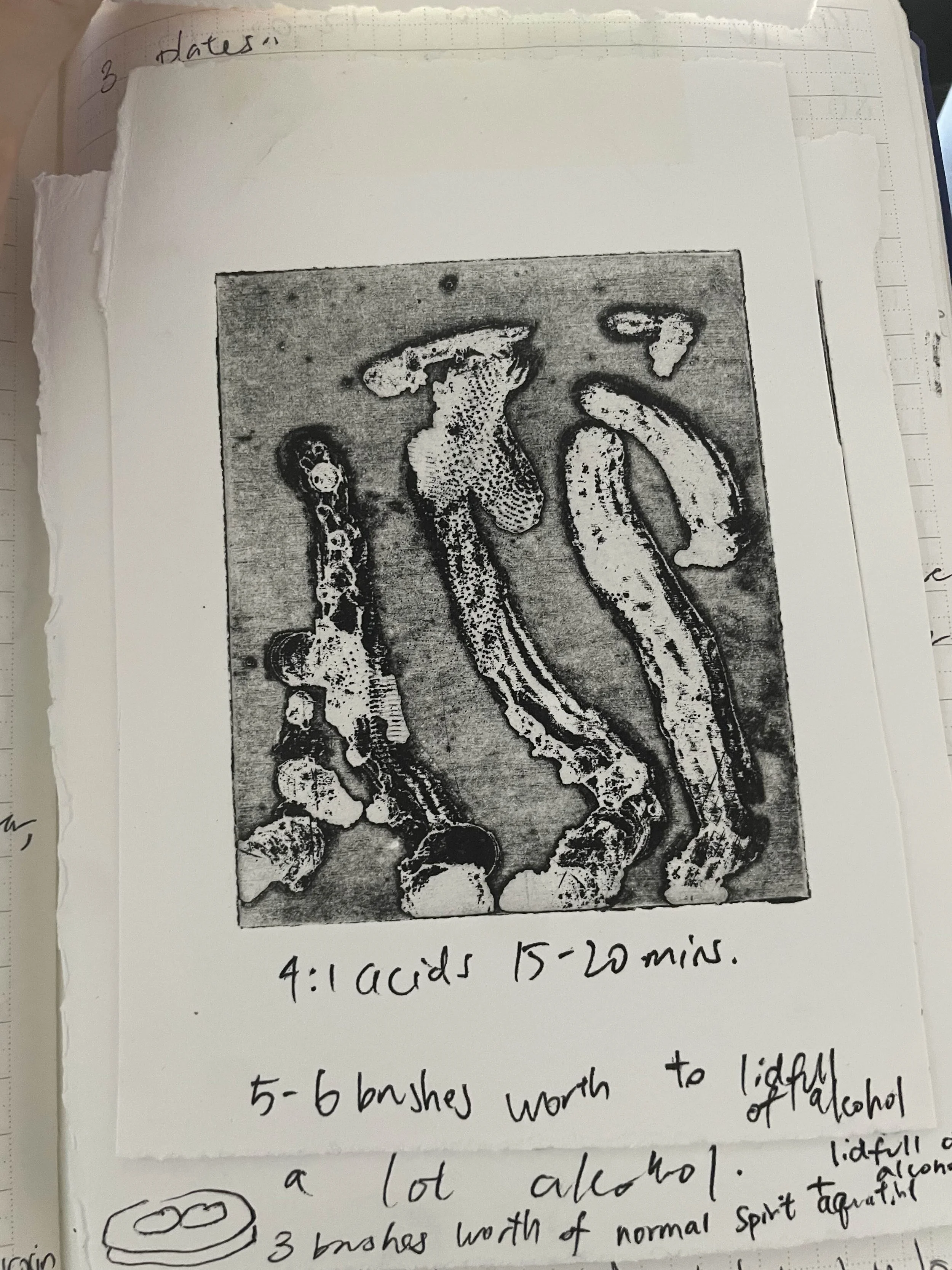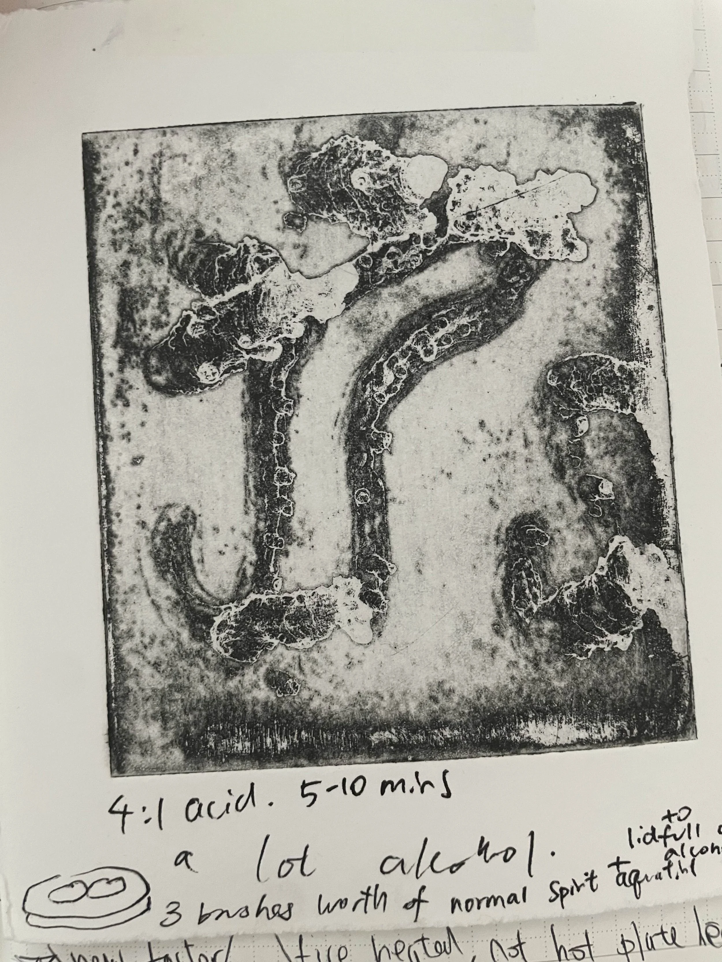 It was also hard to read the progress on zinc plates. They don’t darken without aquatint, so the open-bitten areas just turned into flat, muddy grey. The second plate had the same result — the open bites looked horrendous. Following Brian’s advice, I decided to drop the landscape idea and just draw a creature on a clear sheet of zinc. The medium was too unpredictable, you can’t really control where it flows when it’s evaporating quickly on a hot plate.