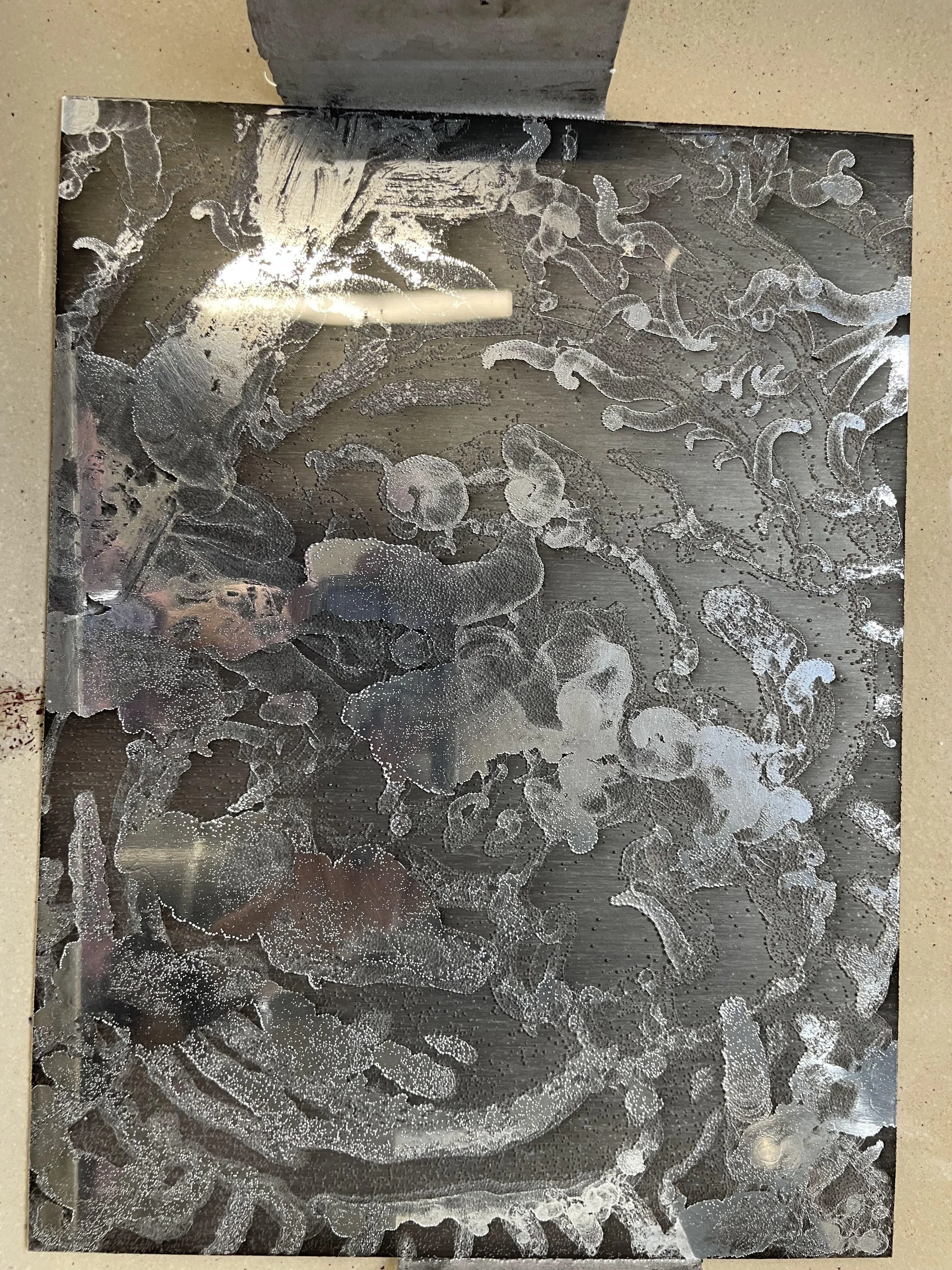 Ah, this is the soap ground that ruined it. Patience is what I lack, and it came back to bite me. The way I drew those lines and circles was so rushed that it turned out terrible. They look like they were drawn by a six year old. I etched it for far too long, until it was almost full black, covering every subtle texture that I had both loved and hated from the earlier processes.