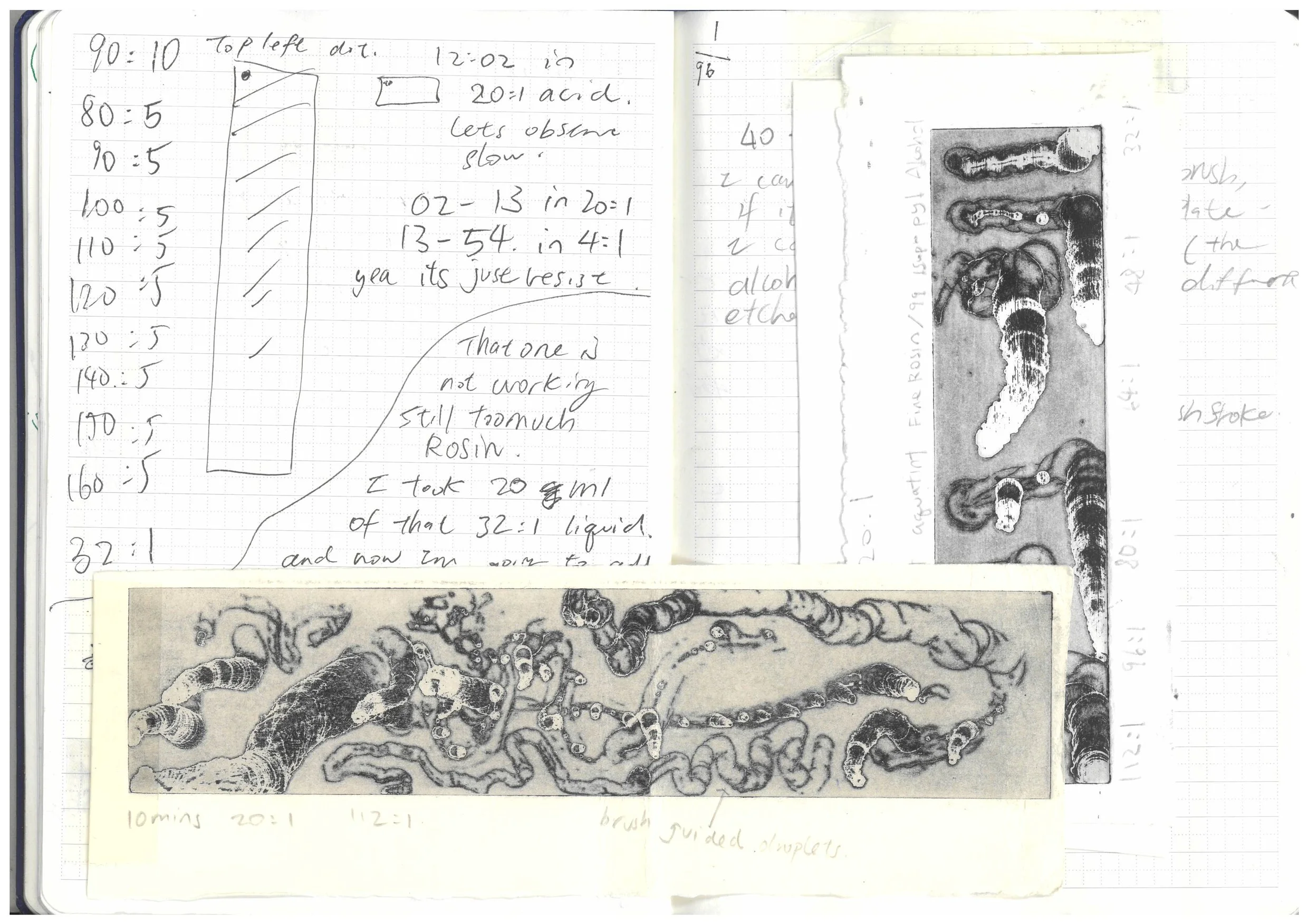 I then started experimenting on these little plates. The first one was way too strong, the rosin basically melted into a solid layer. It worked like a clear varnish, and anything I painted on top resisted the acid completely, leaving white patches. I then started mixing more alcohol into the solution to mess with the ratio of rosin. You can see that some of the painted marks could be etched, although I was using 4:1 nitric acid for this, so it was still quite strong and took a while to take effect.